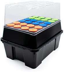 compact 24 site aeroponic propagator with clear humidity lid. Includes pump, three colours of neoprene disks for identifying different plant varieties and a spare set of 5 misting jets